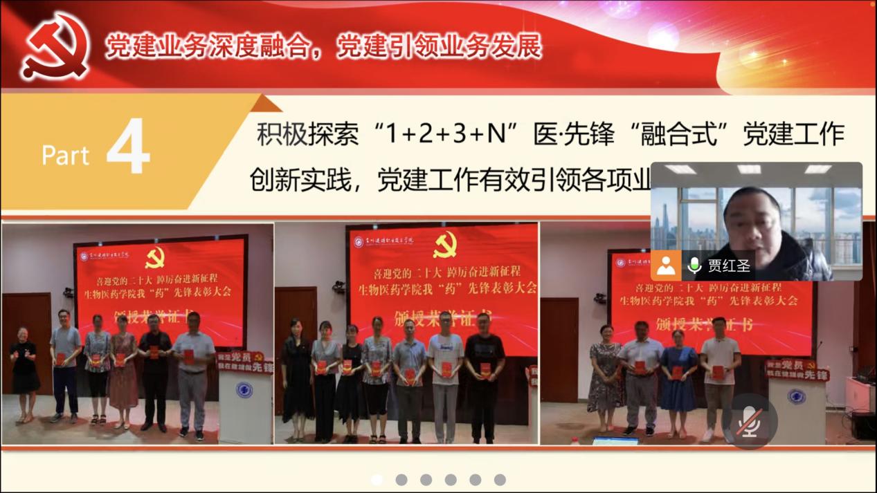 首先,学院教工支部书记贾红圣进行述职发言,他重点围绕一年来教工支部的年度工作开展情况、我“药”先锋力量展示、工作中存在的不足、明年工作思路举措四个方面进行了述职。接着,学生党支部书记孙栋述职发言,他重点围绕一年来学生党支部的主要工作内容、工作不足以及2023年党建工作思路三个方面进行了述职。