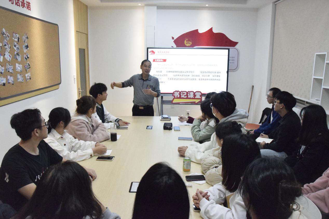 曹书记从“中华民族伟大复兴”这一主题进行延伸讲述了建设中国特色社会主义历程中,伟大的建党精神和自我革命的勇气的不可或缺性,分析二十大报告的主体结构,并对中国式现代化道路进行重点讲解。同时,曹书记从马斯洛人类需求理论出发,阐述了物质文明与精神文明协调发展的重要性。他要求学生会干部在行为处事上积极贯彻党的二十大精神深刻领悟“两个确立”的决定性意义,增强“四个意识”、坚定“四个自信”、做到“两个维护”,始终坚持正确政治方向,不断拓展服务思路、提升整体管理水平,努力为新时代中国特色社会主义贡献自己的力量。