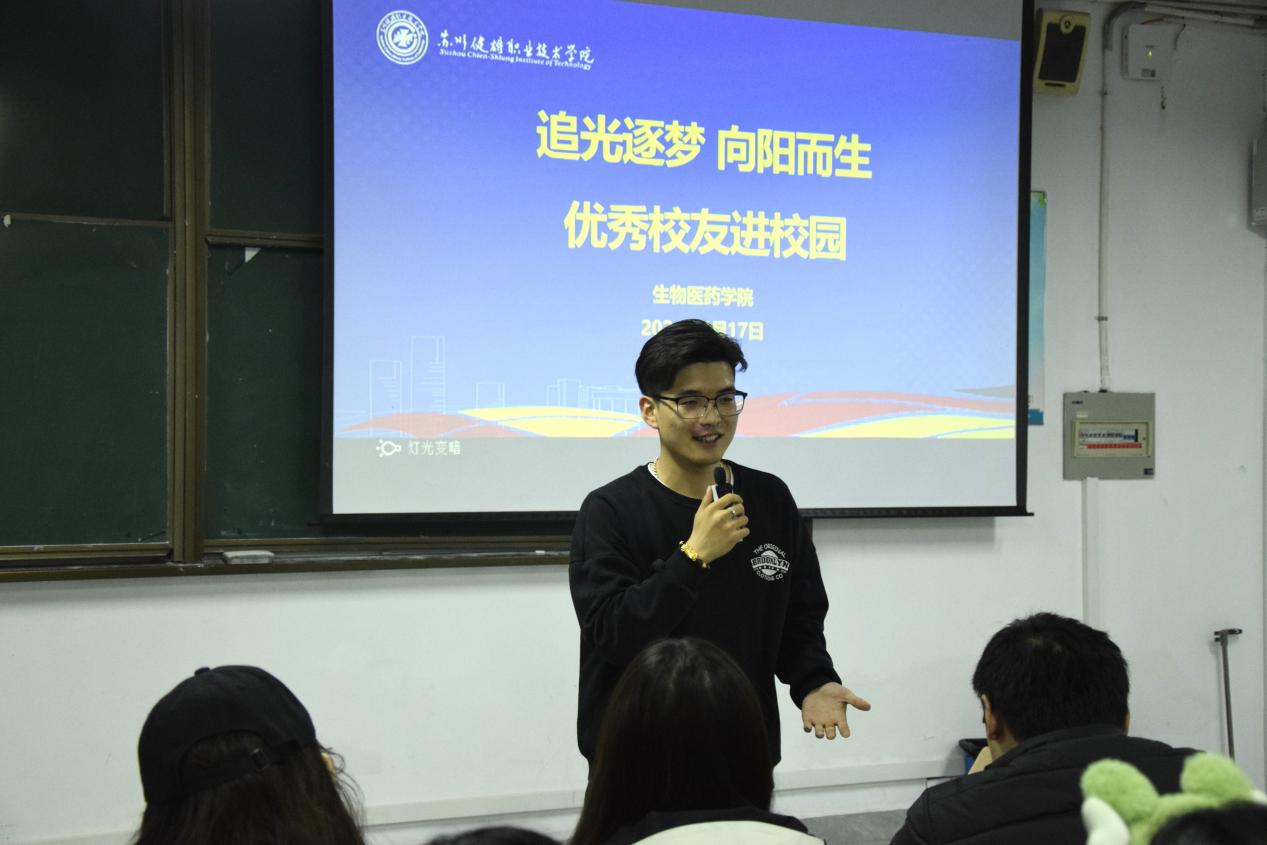 为激发同学们的就业创业热情,引导他们积极面对未来,勇敢追逐梦想。4月17日生物医药学院开展“追光逐梦 向阳而生”为主题的优秀校友进校园活动。活动有幸邀请到了20届毕业生苏州鼎石环境科技有限公司的总经理喻蕾蕾作为主讲嘉宾。