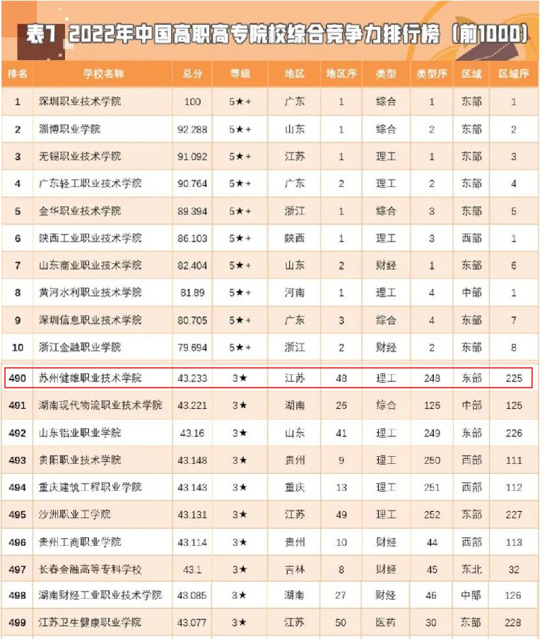 近日,在2022年“金平果排行榜”(中评榜)中国高职高专院校综合竞争力排行榜(1000强)中,我校在全国1484所高职中排名提升至490,江苏省第48,江苏省排名前三的高职院校分别是无锡职业技术学院(全国第3)、江苏农牧科技职业学院(全国第15)和常州信息职业技术学院(全国第24)。