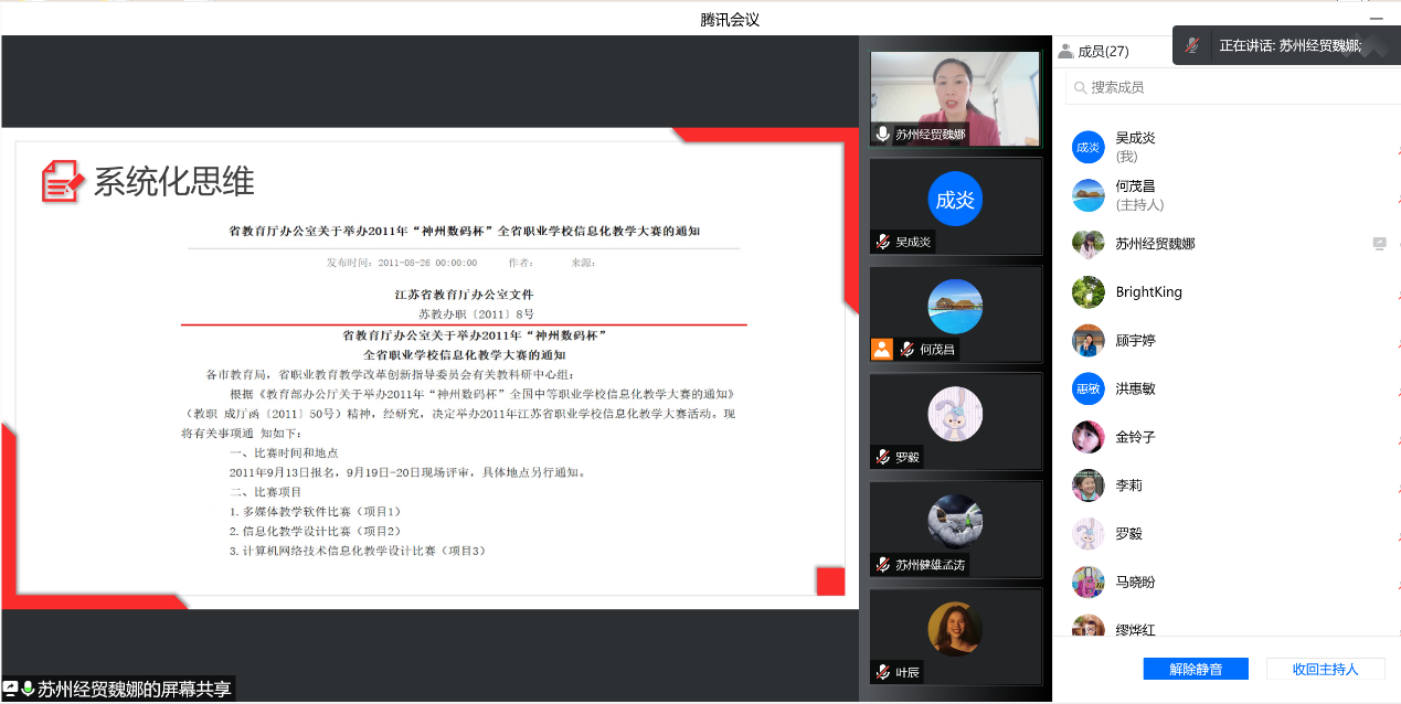 会议中,魏院长分别从系统化思维、项目化实施、精细化推进、可视化评价这几个维度来具体分析该赛事规则。在系统化思维层面,魏院长分享了“比赛是什么”、“为什么要比赛”以及“如何准备比赛”。在项目化实施方面她强调参赛作品首先要真实,教学内容与过程性材料要详实可信。其次她告诉我们无论是参赛还是平时的教学,一定要围绕“立德树人”这一根本要求设计课程环节。三是在准备省赛初赛过程中,教案内容、实施报告和实录视频需要参赛团队投入更多精力。在精细化推进与可视化评价层面中,魏院长提醒老师们要明确参赛主题、勾画思维导图及丰富教学内容,魏院长以自己往年的参赛作品为例,从不同角度生动地与老师们分享参赛技巧。