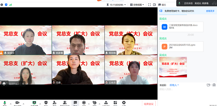 6月15日下午,马克思主义学院、公共教学学院(体育部)在C1-202会议室召开党总支(扩大)会议,会议采取线上与线下结合方式进行。院长周丽雅、总支组织委员王咏芳、宣传委员冯晟及支部书记姚家春、顾瑛参会,会议由学院党总支副书记吴成炎主持。