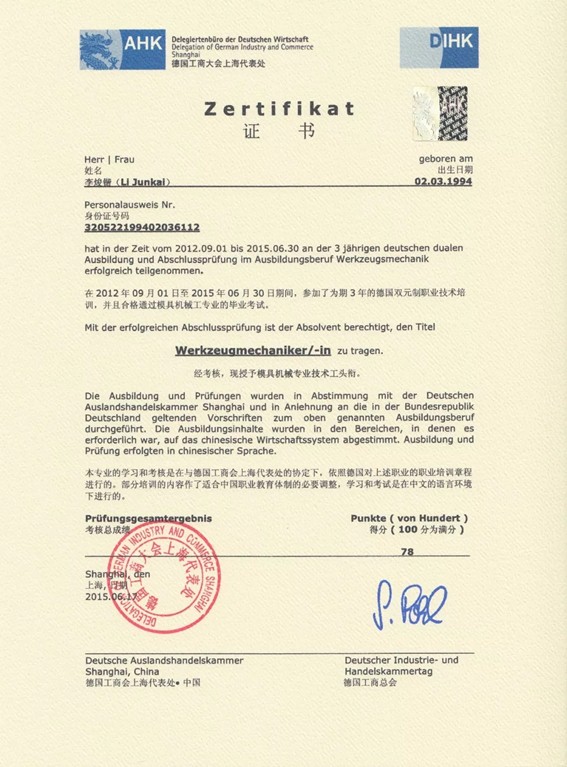 能力鉴定:双元制职业教育协会颁发《模具制造技术》证书;德国工商会颁发《模具机械工》职业资格证书。